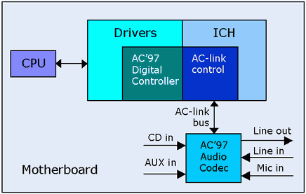 Напомню идеологию работы AC'97-звука на материнских платах: так как мощность современных CPU намного превышает мощность DSP звуковых карт, а данные всё равно хранятся в ОЗУ, было решено переложить работу по обработке звуковых потоков на центральный процессор, оставив в железе лишь интегрированный в ICH чипсета AC-Link контроллер, подающий готовый сигнал прямо на AC'97-кодек.