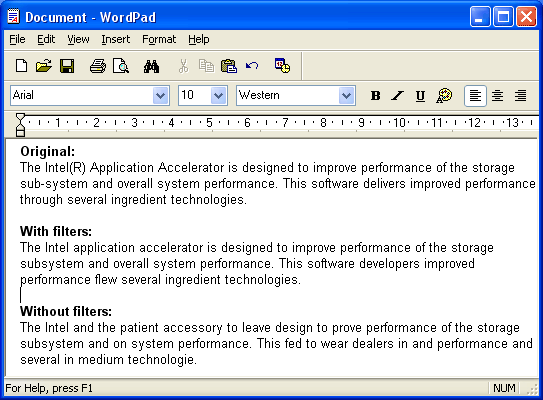 Вдохновлённый успехом, я предпринял попытку продиктовать более осмысленный текст, а заодно выяснить насколько эффективна система фильтрации в реальном времени, которую нам предлагают. Я взял самый обычный технический текст абзац из readme.txt к утилите Intel Application Accelerator. Диктовка велась в среднем темпе, 2-3 слова в секунду слитной речью с небольшими паузами, полагающимися по смыслу. На иллюстрации можно видеть оригинальный текст, чуть ниже распознанный текст с включёнными фильтрами, и в конце распознанный текст без фильтрации.