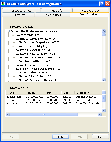 Для измерения загрузки CPU при различном числе потоков использовался тест RightMark DirectSound 1.0 alpha. Диагностика DirectSound показала наличие 32 аппаратных потока DS и DS3D. Имеется ввиду, что первые 32 голоса будут обрабатываться специальными алгоритмами Sensaura 3D. Если их будет больше в ход пойдут программные алгоритмы от Microsoft. Необходимо понимать эту разницу.