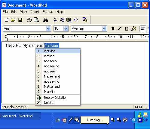 К сожалению, в базе данных компьютера есть Marxine, Maxine, Maxey и даже Matsui, но вот моё имя отсутствует. :) Также, налицо попытка компьютера проанализировать фразу и подобрать наиболее подходящее по смыслу слово. Кстати, неточно распознанные слова можно выбрать из списка похожих или передиктовать заново.