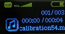 Индикация совсем простенькая. Индикаторы режима эквалайзера, громкости, режима повтора (на картинке не видно) и заряда батареи располагаются в верхней оранжевой части OLED-дисплея. Раздел зон дисплея на зоны оранжевых и голубых светодиодов виден даже невооруженным взглядом при выключенном плеере. В голубой зоне — индикатор номера текущего трека к общему количеству трэков в памяти, индикатор текущего времени воспроизведения к длине трека и название трека. Простенько и со вкусом. Две здоровенные ноты, в общем, тоже не просто украшательство, а индикатор воспроизведения (при проигрывании включается анимация, на паузе — останавливается).