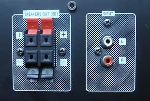 На задней панели расположены линейный вход (стерео RCA), механические зажимы и сетевой разъем питания. Кроме всего перечисленного, присутствует схема подключения набора к различным стерео источникам, которая поможет правильно подключить провода начинающим пользователям.