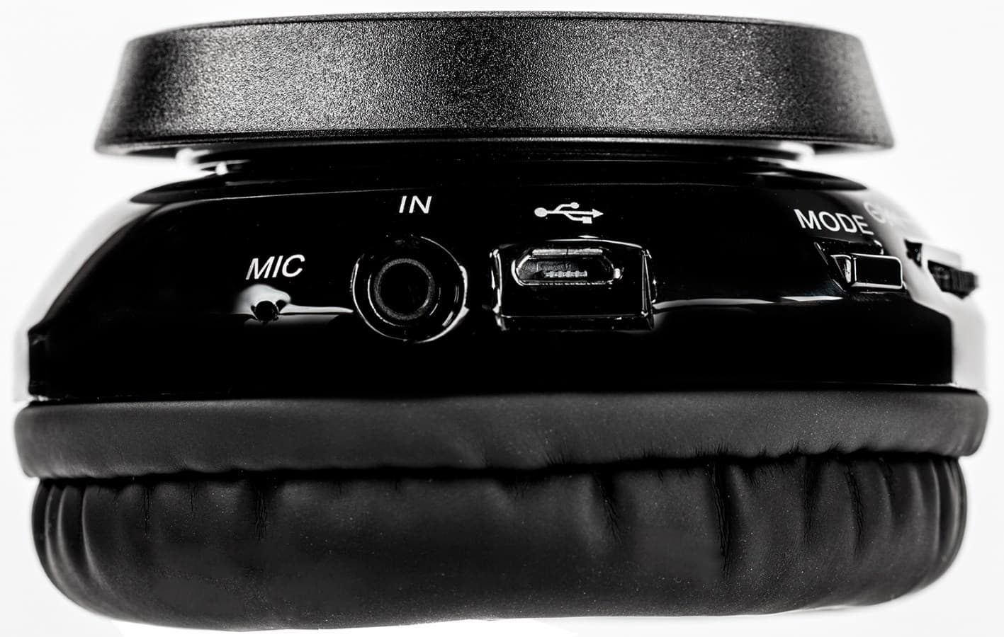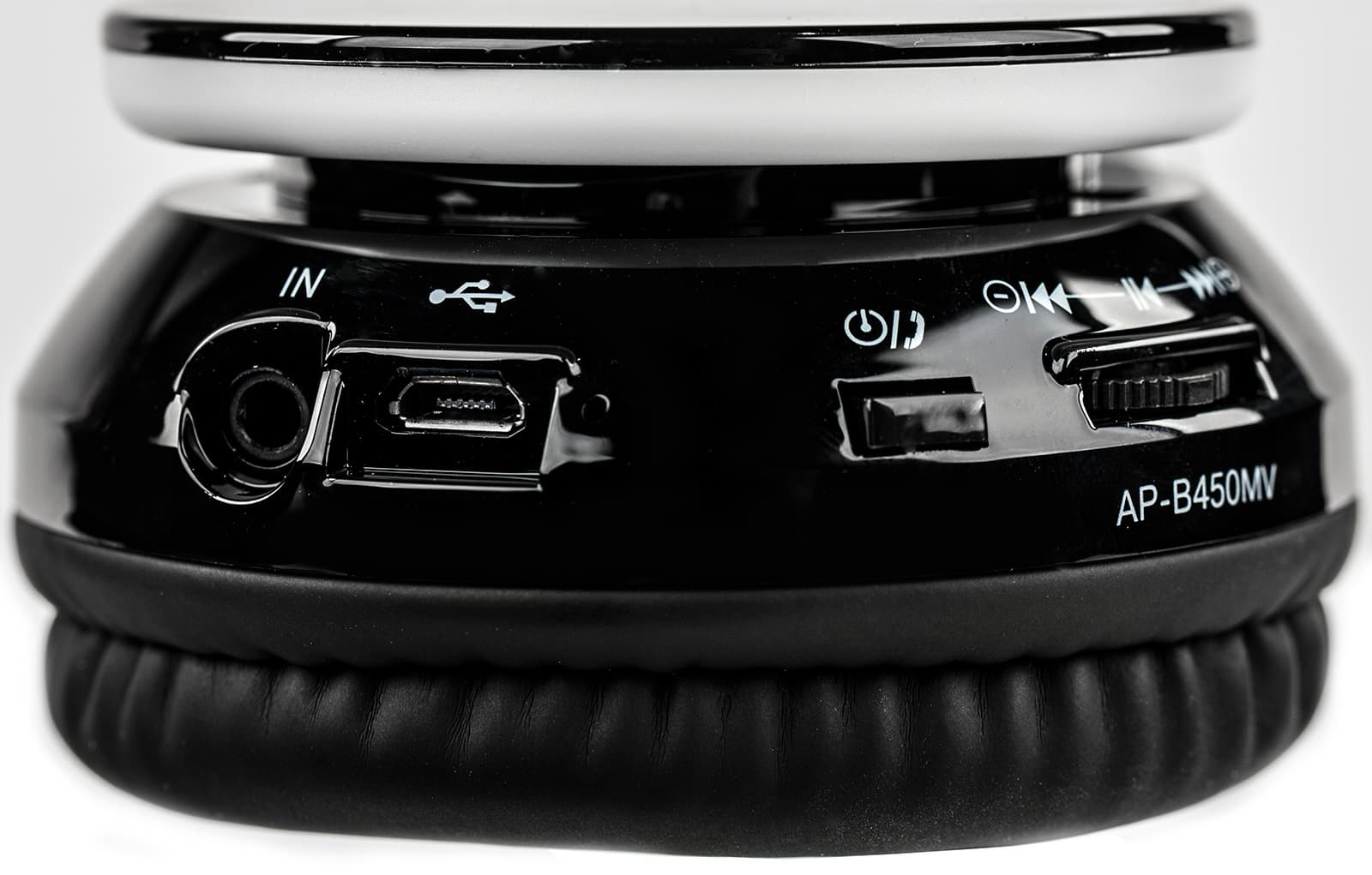 Все элементы управления наушниками сосредоточены на левой чашечке. У AP-B450MV это кнопка включения/приема вызова, а также совмещенный с кнопкой приостановки трека регулятор прокрутки/громкости. Быстрый сдвиг колесика в сторону переключает трек, а продолжительный — изменяется уровень громкости. Здесь же расположен микрофон, разъем 3,5 мм для проводного подключения и Micro-USB для зарядки.