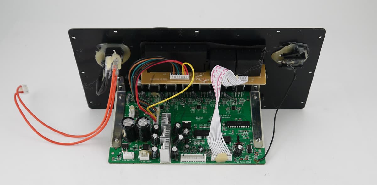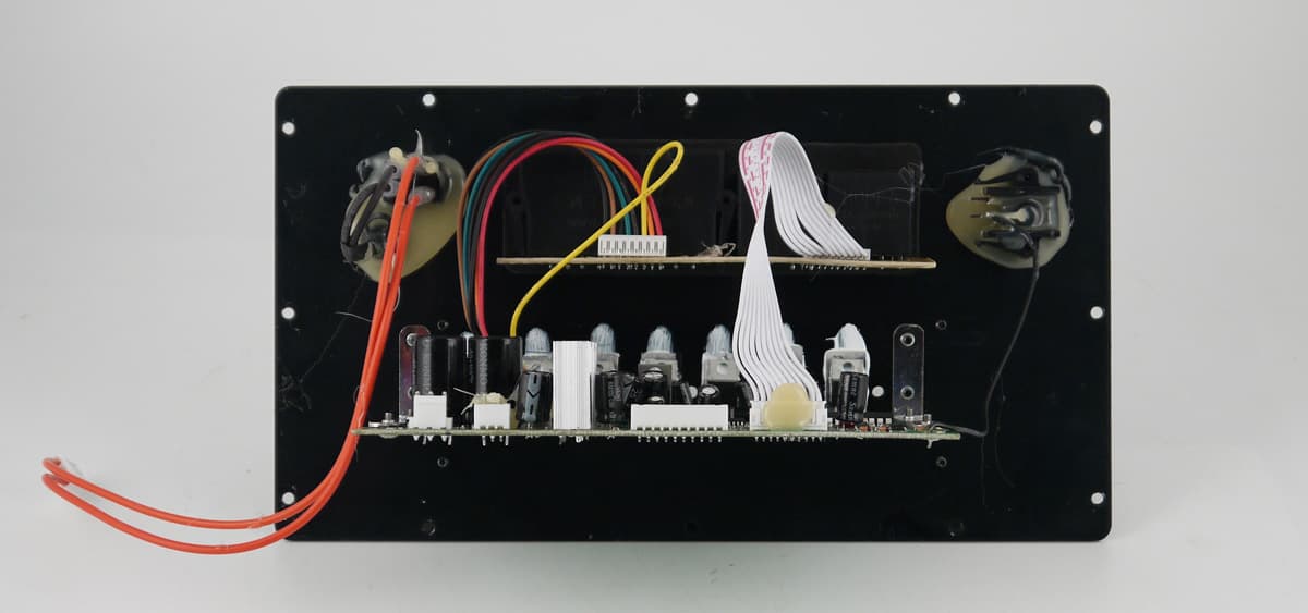 Практически вся электронная часть сосредоточена на одной плате, закрепленной на металлической пластине, которая закрывает вырез в задней стенке сабвуфера. Отдельно расположены источник питания, плата которого закреплена на днище корпуса, а также медиаплеер и блок индикации и управления в передней части сабвуфера.