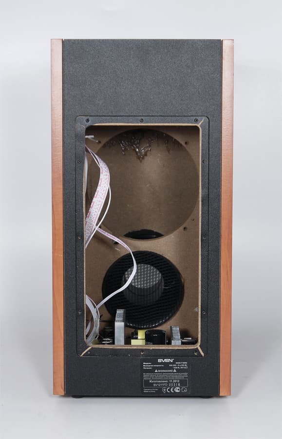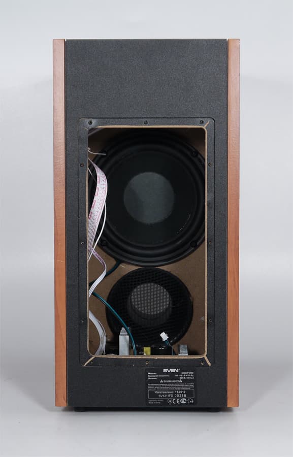 В сабвуфере установлен динамик с диаметром диффузора 14,5 см, мощностью 50 Вт и сопротивлением 6 Ом. Места установки динамика и вывода соединительных проводов снабжены уплотнителями.