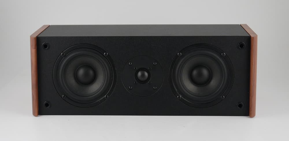 Боковые панели центральной, фронтальных и тыловых колонок выступают вперед относительно передней стенки и имеют скругленную переднюю кромку, зрительно оформляющую переход к съемному грилю из неплотной ткани на пластиковой рамке. Фронтальная часть центральной колонки скошена, и ее динамики направлены слегка вверх, что будет полезно при размещении этой колонки ниже головы слушателя, а вот при размещении на каком-то возвышении (например, на полке) это окажется скорее минусом.