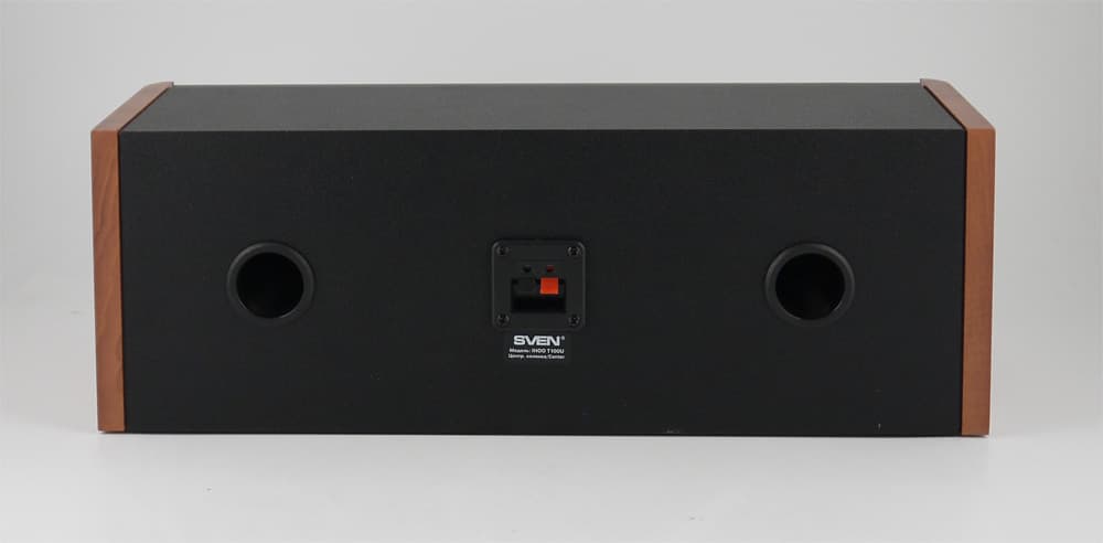 Небольшие ножки в виде круглых наклеек из пористой резины толщиной 2 мм есть только у центрального и фронтальных сателлитов, для тыловых колонок предусмотрен металлический подвес для крепления к стене. Правда, просто повесить тыловые АС на саморез, ввернутый в стену, будет не самым лучшим решением: все колонки, кроме сабвуфера, должны быть определенным образом сориентированы относительно слушателя (схему даже не надо искать: она имеется в руководстве по эксплуатации), а как реализовать это с помощью имеющегося простейшего подвеса, должен придумать владелец. Справедливости ради отметим, что это относится не только к Sven T100U, однако у этой модели тыловые колонки не имеют ножек, т. е. производитель не предусмотрел вариант их установки на полку, а при подвесе к вертикальной поверхности зазор между ней и выходом фазоинвертора составит всего 5 мм.