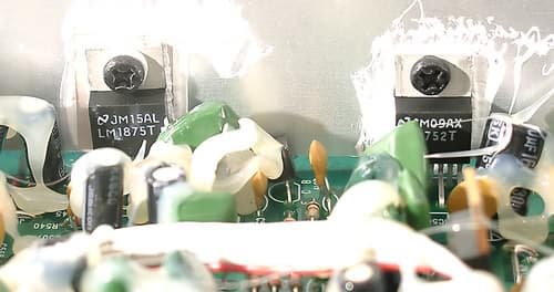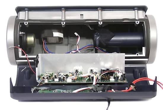 Блок питания размещен внутри корпуса сабвуфера. Здесь вы можете видеть так же расположенную усилительную плату и радиатор. В качестве усилителя производитель использует две усилительные микросхемы от National Semiconductor.