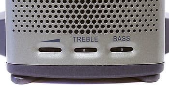На правом сателлите расположены регулятор громкости и уровеня высоких и низких частот. Регуляторы выполнены в виде колесиков. Процесс регулировки будет особенно удобен обладателям женских пальчиков. Дело в том, что колесико регулятора выступает из корпуса всего лишь на миллиметр, а существующие выемки только усугубляют неудобство.