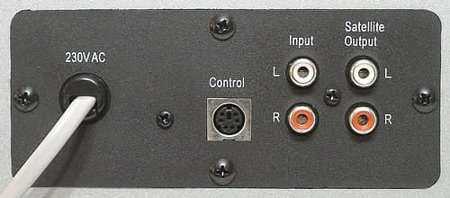 Панель коммутации расположена на задней стороне сабвуфера и включает в себя разъем для подключения проводного пульта ДУ (Control), линейный вход для подключения внешнего источника (Input) и разъемы для подключения сателлитов (Satellite Output).