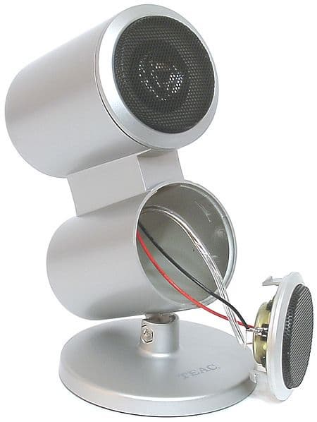 Габариты сателлита с подставкой составляют 8,5×15,5×8,5 сантиметров. Корпус колоночки выполнен из пластика толщиной два миллиметра. Как вы можете видеть на фотографии сателлита, внутри корпуса никакого наполнителя не наблюдается. Динамические головки, используемые в сателлитах, совершенно одинаковые. С подобными твитерами мы с вами уже встречались в колоночках из наборов Сreative I-trigue и harman/kardon Elegant. Диффузор изготовлен из фольги, диаметр диффузора составляет три сантиметра, гибкий подвес выполнен из вспененного полимера. Соединение между двумя твитерами осуществлено параллельное. К нашему большому удивлению динамики не имеют магнитного экранирования. В близости от монитора менее чем на десять сантиметров наблюдаются незначительные наводки.