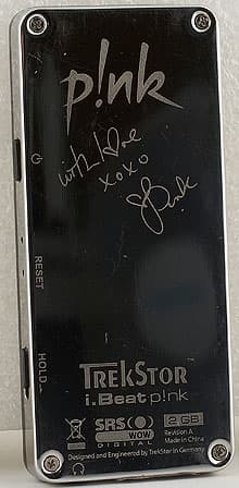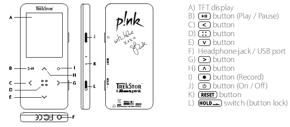 Заканчивая обзор внешности испытуемого, остается сказать, что кнопка включения/выключения, Reset и ползунок блокировки располагаются на правом боку, левый и верх абсолютно свободны. А на металлической (что плюс) задней поверхности выгравирован автограф певицы Pink, которой плеер и обязан своим названием. Изначально данная модель планировалась как limited edition, однако, по «просьбам трудящихся», в Trekstor решили поставить ее на поток. Вполне разумно, благо плеер вполне подойдет и поклонникам творчества данной звезды мирового шоу-бизнеса, и тем, кто к ней равнодушен. Поскольку вся «заточка» заключается в автографе, нескольких фотографиях в памяти, да существовании плеера с гламурно-розовой передней панелью. Но для поборников «классического» стиля есть черный вариант, который был у нас на тестировании, и с которым, кстати, очень хорошо и необычно сочетается розовая подсветка сенсорных кнопок :)