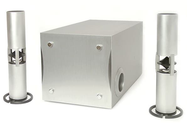 Для воспроизведения музыки и звуковой дорожки к фильмам в комплекте с Hi-Fi PC идёт 2.1-акустика. Активный сабвуфер с добротным деревянным корпусом и достаточно «взрослым» звуком, а также необычной формы сателлиты. Для микросистемы звучание просто отличное. Саб, выполненный по схеме «резонансная камера», добротно и чисто играет все басовые партии практически на любом жанре музыки, а звонкие и чистые высокие частоты удаются благодаря весьма качественным СЧ/ВЧ-динамикам с алюминиевым диффузором, по два в каждом сателлите. Единственная претензия по звучанию недостаточно проработанная середина. С мощность у комплекта проблем нет, на высокой громкости перегрузка динамиков отсутствует. Не понравилось только недостаточно плавное цифровое управление уровнем громкости и отсутствие эквалайзера/регуляторов тембра.