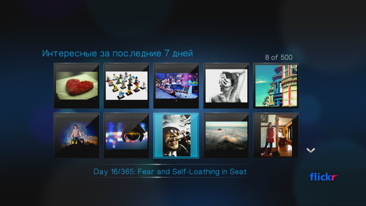 Онлайновый сервис просмотра фотографий представлен flickr. При его использовании можно выбрать некоторые категории файлов, например самые интересные или недавно опубликованные. Только вот явно есть какие-то проблемы с разрешением картинок — уж очень они грустно выглядят на FullHD-телевизоре.