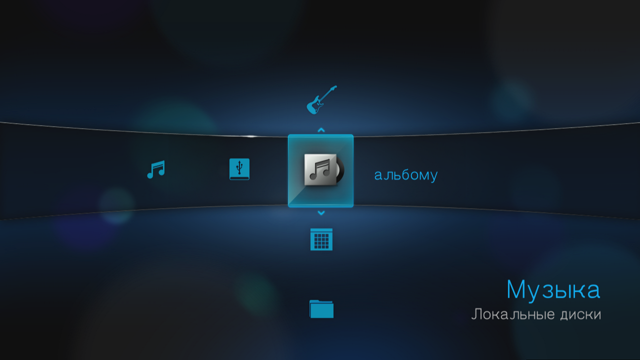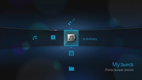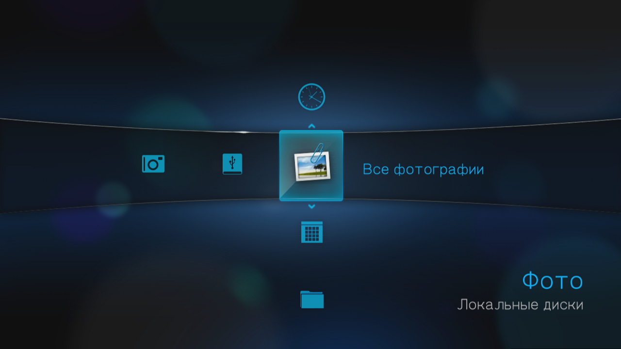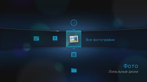 Первый выбор состоит из пунктов «Видео», «Фото», «Музыка» и «Настройки», которые были описаны выше. После определения типа контента (влияет на фильтрацию файлов во время просмотра списков) необходимо выбрать источник — локальные диски, сетевые ресурсы, медиасерверы или интернет-сервисы (разные для каждого типа контента).
