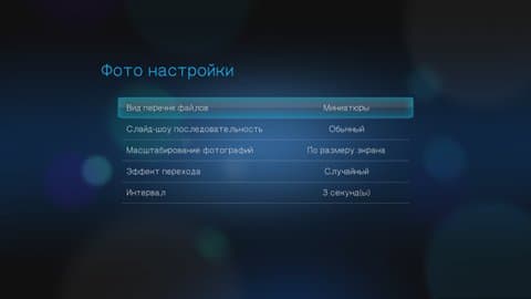 Кроме этого, для видео настраиваются субтитры — размер шрифта, вид контура, автоматическое использование при наличии. Для просмотра фотографий в режиме слайд-шоу выбирается интервал и вид перехода (один из семи вариантов или случайный выбор), а также режим масштабирования. У музыкальных файлов единственный дополнительный параметр — показывать название файла или название композиции.