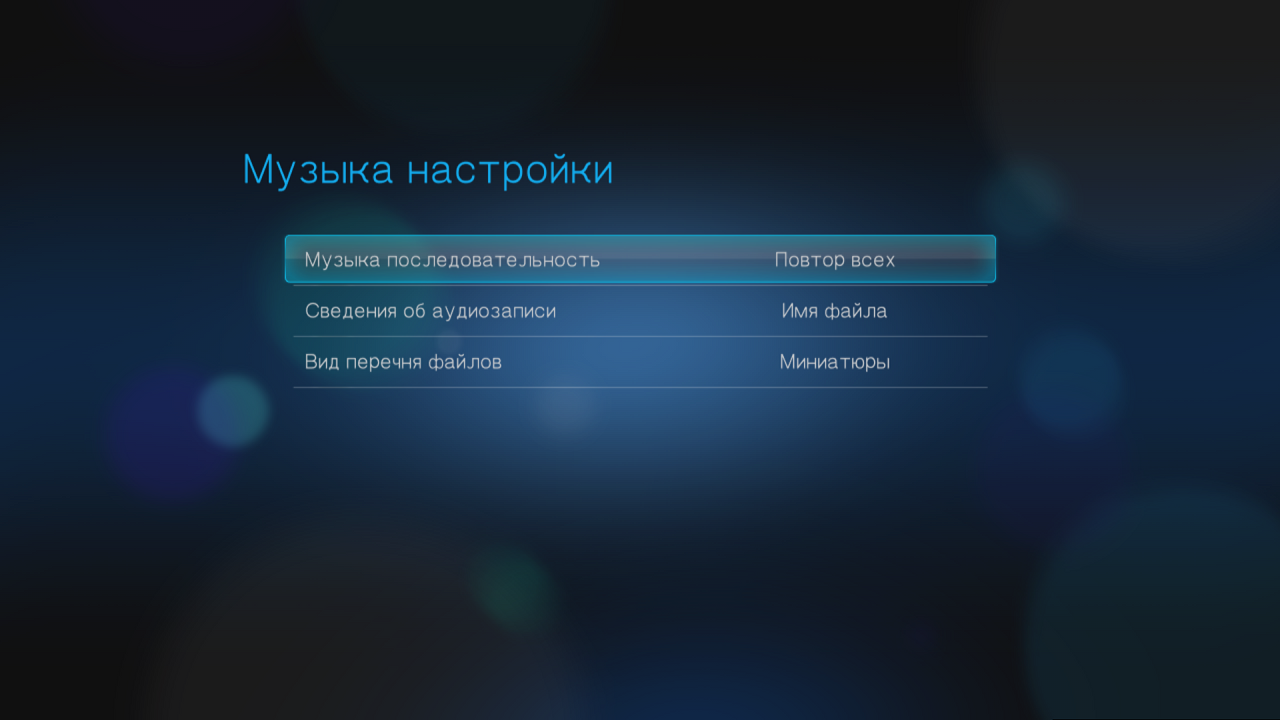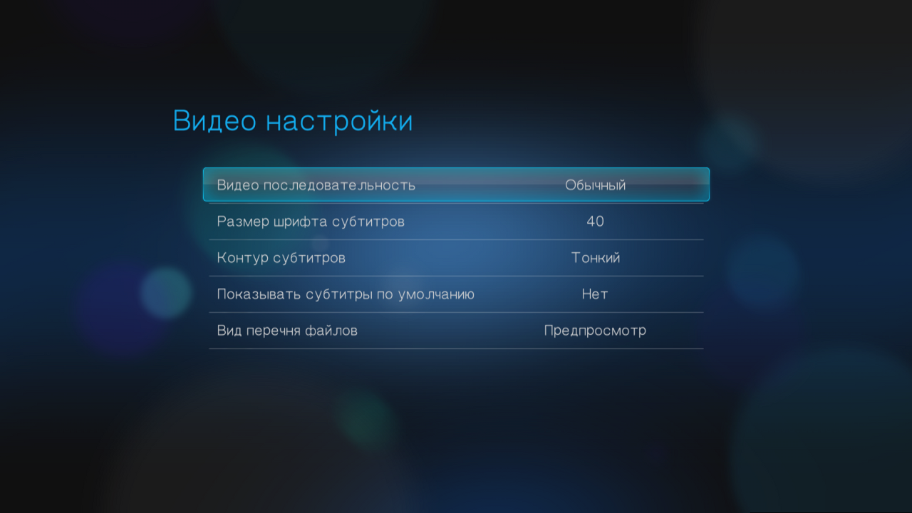 Следующие три группы относятся к воспроизведению видео, фото и музыки соответственно. Для всех типов файлов можно выбрать последовательность воспроизведения и вид перечня файлов и директорий (миниатюры, список, предпросмотр). Плеер поддерживает использование внешних файлов jpeg для оформления иконок папок.