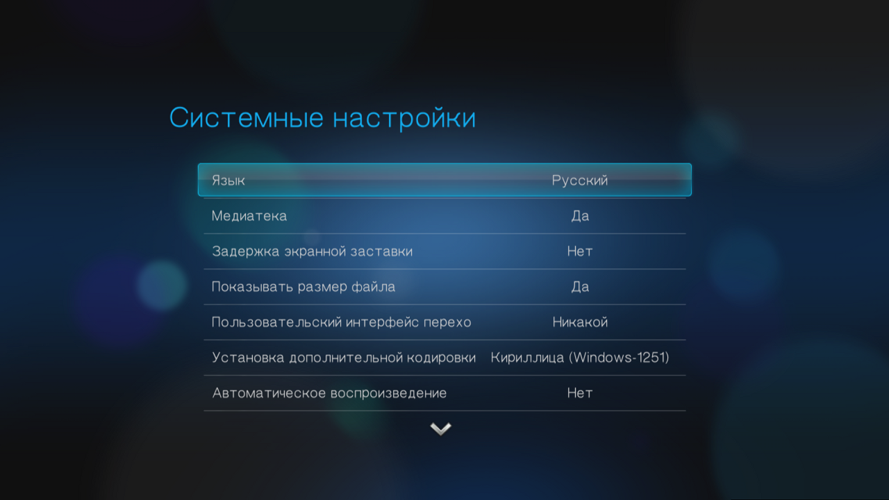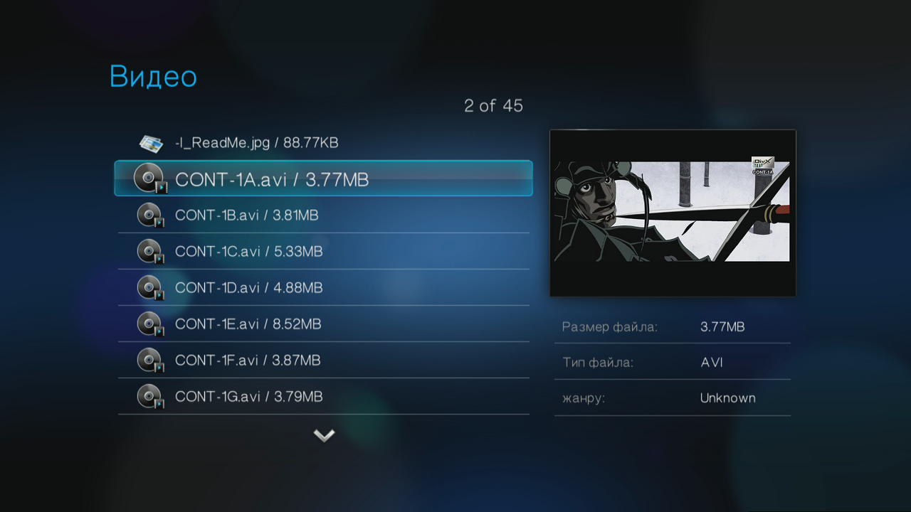 «Общение» с плеером происходит через меню с использованием пульта дистанционного управления. Оформление его достаточно приятно и удобно — используется аналогичный предшественнику вариант «сетки» с выбором пунктов по вертикали и горизонтали. Отдельно отметим хорошую скорость отклика, не вызывающую дискомфорта.