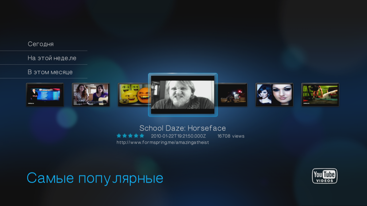 Кроме файлов, пользователю доступен просмотр видеороликов с популярного сервиса YouTube. Предусмотрен выбор по популярности, рейтингу и другим критериям. Удачным ходом является поддержка HD-форматов, транслируемых с этого сервиса. В этом случае на телевизорах с большими экранами ролики не выглядят так ужасно, как для стандартного разрешения.