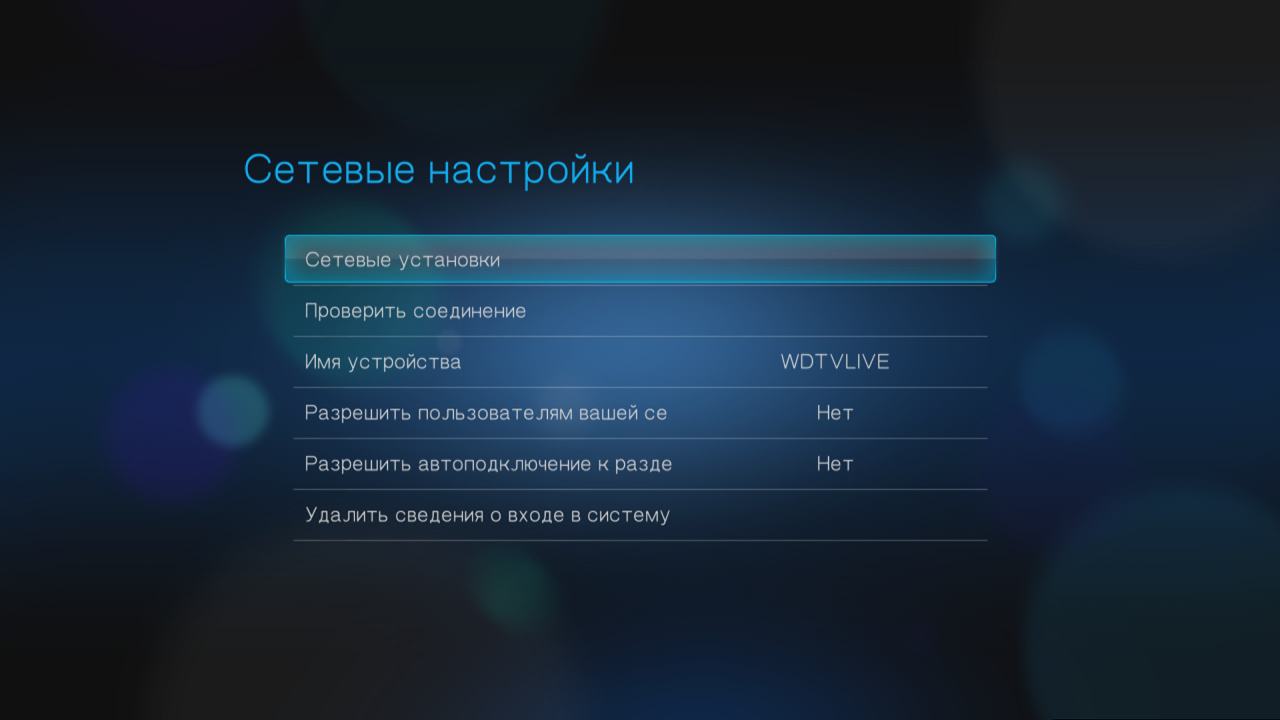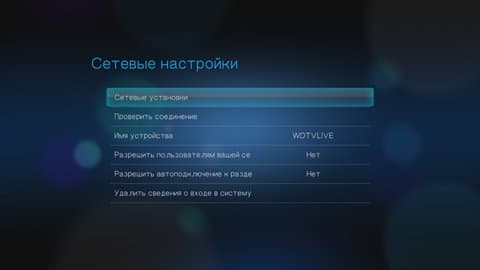Здесь же находятся параметры, разрешающие доступ к подключенным USB-накопителями по сети, автоподключение сетевых ресурсов и сброс запомненных сетевых реквизитов (имени пользователя и пароля). Скорость доступа по сети типична для данного класса устройств — порядка 5 МБ/с на чтение и 3 МБ/с на запись (причем запись поддерживается и на NTFS). Имя устройства можно переопределить с установленного по умолчанию «WDTVLIVE», а вот рабочая группа не меняется.