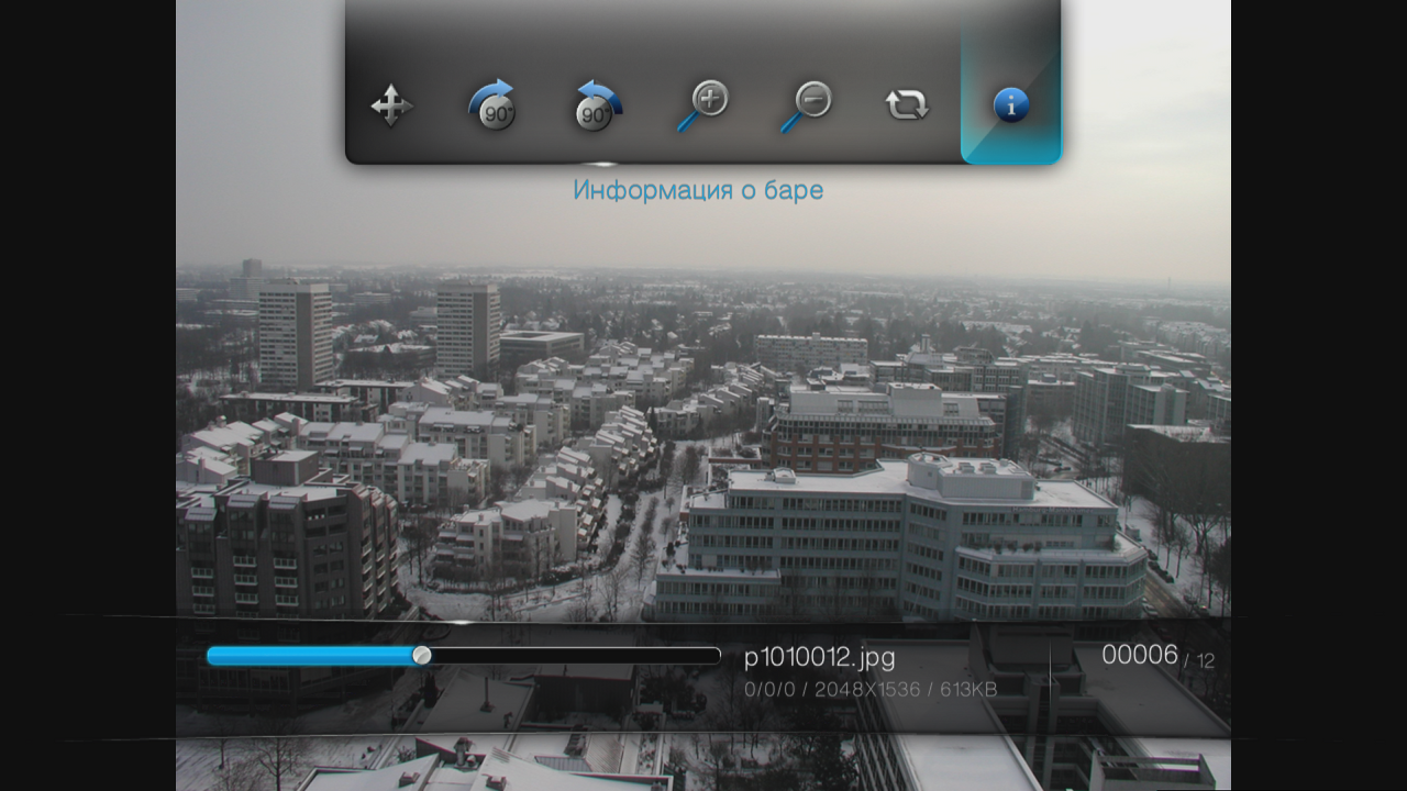 Начнем как обычно с самого простого — фотографий. Устройство может работать с файлами форматов jpeg, gif, tiff, bmp, png. Во время просмотра изображение можно поворачивать и масштабировать. Флаг ориентации из exif читается и используется правильно. Также есть режим отображения краткой информации о файле — дата изменения, разрешение, размер. «На лету» можно поменять и режим повтора для слайд-шоу. Для установки указанных опций используется специальная выделенная кнопка на пульте с одноименным названием. К сожалению, ее действие «перебивает» все остальное управление — если на экране видно меню «option», то необходимо его сначала убрать, даже для остановки проигрывания.