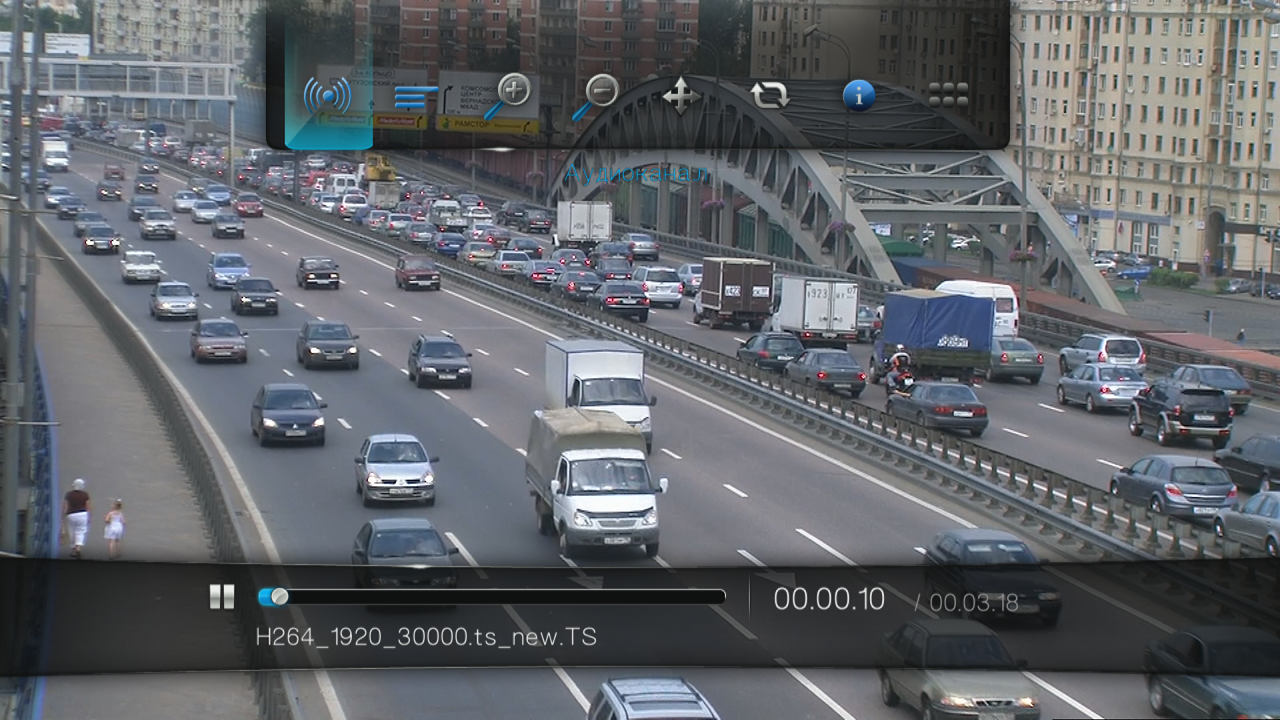 Во время просмотра можно пользоваться перемоткой — до 16х (в зависимости от формата) в обе стороны. Конечно реальная скорость зависит от производительности источника данных. К сожалению, не предусмотрено быстрой навигации по таймкоду. Некоторой компенсацией этого может служить автоматическое запоминание позиции при остановке воспроизведения. Если потом выбрать тот же файл, то плеер предложит начать с нее или же с самого начала. Еще одним быстрым способом навигации является использование кнопок перехода на следующий/предыдущий файл во время перемотки — они позволяют «перескакивать» сразу на 10 минут.