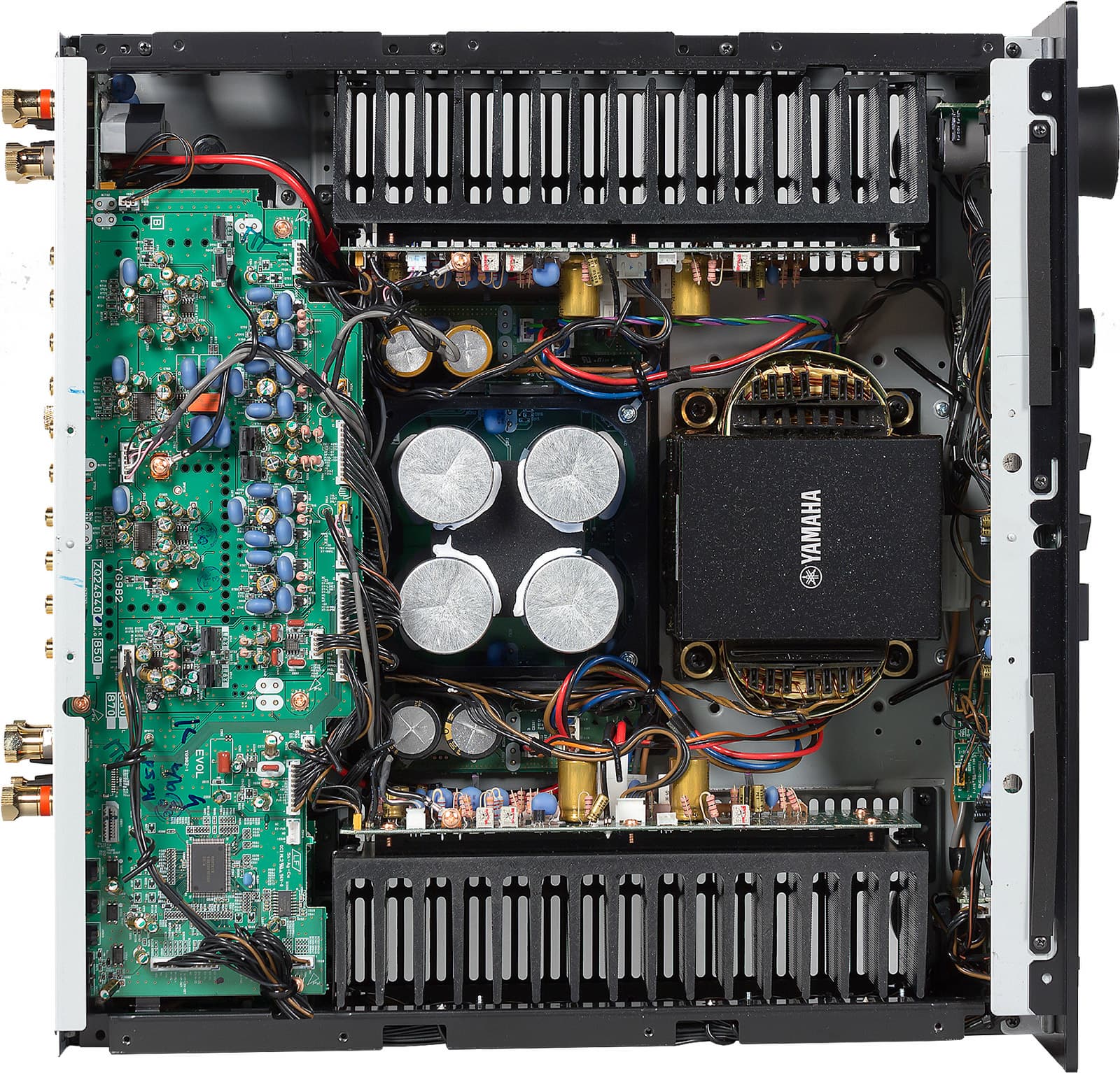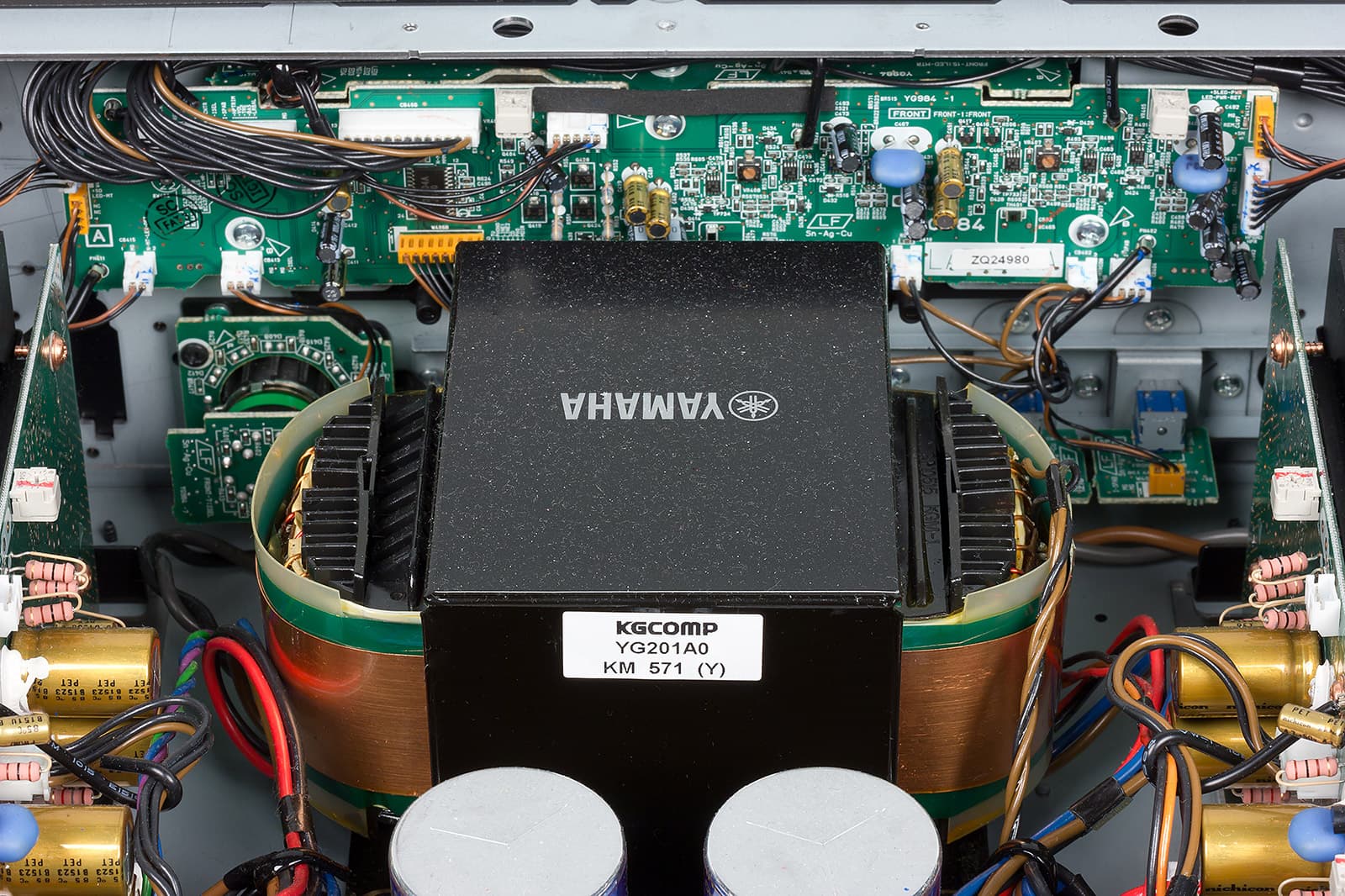 Заглянем внутрь. Трансформатор имеет немалый размер и смонтирован в отдельном экранированном блоке. Установлены четыре «бочки» конденсаторов емкостью по 18 000 мкф. Конструкция симметричная, источник питания расположен посередине, усилители мощности — симметрично слева и справа. Выходные звенья УМ — на полевых МОП-транзисторах. Производителем декларируется «разработанная специалистами Yamaha уникальная технология симметричного усиления мощности с “плавающими” источниками питания». Корпус массивный, жесткий и устойчивый.