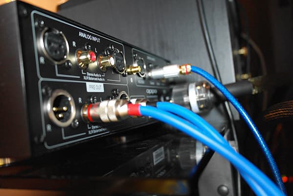 Тыловая часть усилителя, помимо немалого набора входов, обращает на себя внимание необычным дизайном клемм (как выяснилось в ходе тестирования, удобных в подключении), наличием входа для проигрывателя грампластинок (как с МС-, так и с ММ-головкой), выходом Pre-out и входом Main-in (прямым входом). Сигнал с этого входа идет в обход регулировок тембра и громкости сразу на усилитель мощности. Именно к нему мы и подключаем аналоговый выход ЦАП Oppo HA-1 и осуществляем регулировку громкости на ЦАП.