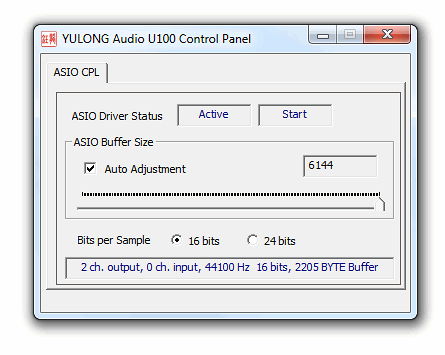 Что выделяет YuLong U100 среди самоделок — так это драйвера с поддержкой ASIO, выбором битности и индикацией текущего режима. ASIO-панель весьма необычная. Она показывает реальный режим работы карты — частоту и разрядность данных, а также позволяет поставить огромный размер буфера. Это необходимо для отсутствия щелчков в режиме побитной передачи через ASIO даже на слабых системах.