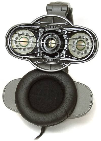 Столь необычный дизайн наушников вызван их конструктивными особенностями. Корпус наушника имеет вытянутую форму не случайно. Здесь располагаются по три динамических головки с диаметром мембран 37 мм. Таким образом, наушники являются довольно габаритными и их умение складываться, как показано на фотографии выше, вероятно, служит для экономии места в не рабочем состоянии.