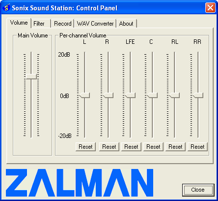 Панель управления картой выполнена в виде одного окошка с пятью вкладками, на которых расположены различные настройки. На первой вкладке «Volume» находится микшер с регуляторами общей громкости и отдельно каждого из шести каналов. Индикации уровня сигнала нет. Кнопка «Reset» сбрасывает настройки уровня в исходное положение 0 дБ.