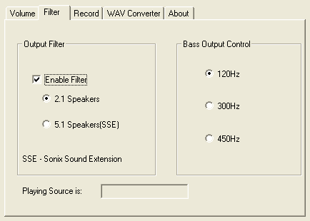 На следующей вкладке «Filter» расположены опции выбора частоты среза кроссовера (120, 300, 450 Гц) и включения режима SSE (разложения стереосигнала на шесть каналов).