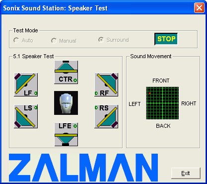 Кроме панели управления из системного трея можно вызвать окошко "Speaker Test". Здесь предоставляется возможность подать тестовый сигнал на имеющиеся каналы. Режим «Auto» и «Manual» осуществляет поочередную подачу тестового сигнала в каждый канал отдельно. В режиме «Surrond» — непрерывный шумовой сигнал позиционируется в пространстве по кругу.