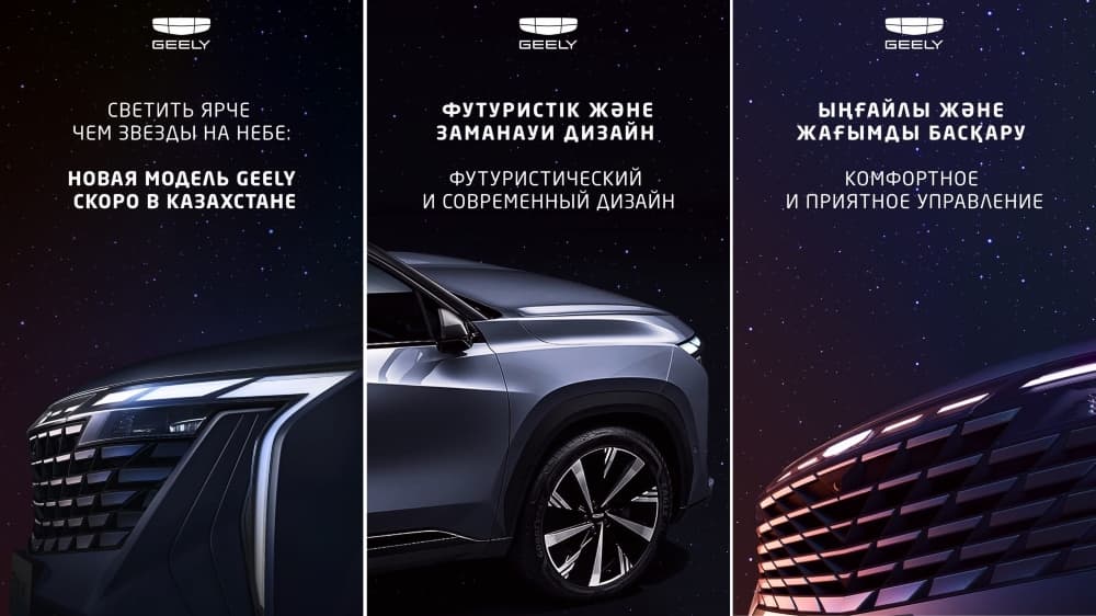 Geely начала публиковать тизеры нового автомобиля для рынка Казахстана. Однако секрета не случилась: в картинках очень просто опознать новейший кроссовер Geely Atlas L, он же Starray.