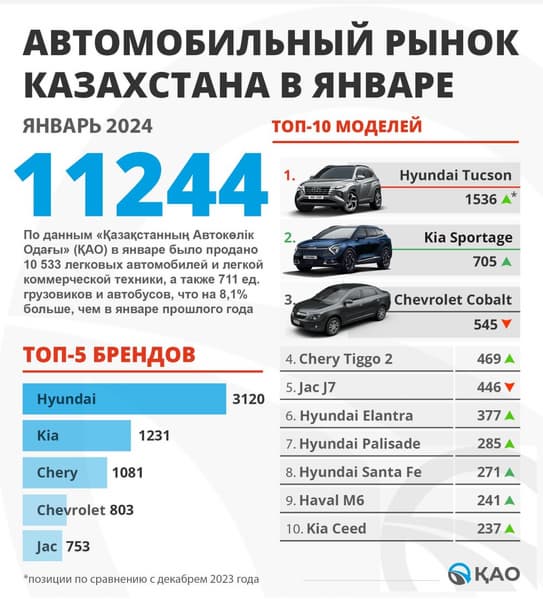 А вот на третье место в топ-3 брендов впервые вышла Chery: китайский автопроизводитель сумел продать в Казахстане за прошлый месяц 1081 автомобиль — прирост на 73,8% в годовом выражении. Самой популярной моделью Chery в Казахстане стал компактный кроссовер Tiggo 2 — он занял четвёртое место модельного рейтинга. В топ-3 вошли Hyundai Tucson, Kia Sportage и Chevrolet Cobalt.