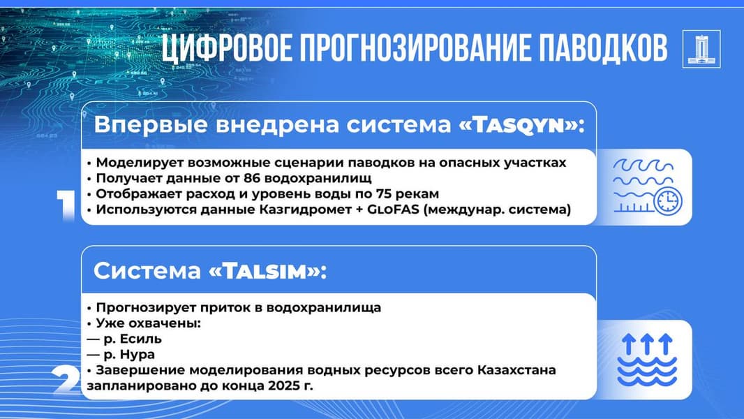 Власти впервые применяют систему Tasqyn. Это инструмент моделирования паводковых сценариев для уязвимых территорий Казахстана. Система выводит данные о работе 86 водохранилищ, об уровне воды в 75 реках. Tasqyn анализирует информацию, полученную от «Казгидромет» и платформы GloFAS.