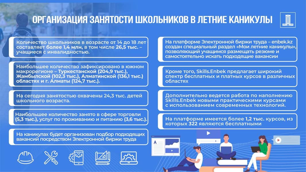На платформе Электронной биржи труда enbek.kz создали раздел «Мои летние каникулы», на котором школьники с 14 лет и студенты могут разместить свое резюме для поиска работы. Об этом рассказала министр труда и социальной защиты населения Казахстана Светлана Жакупова.