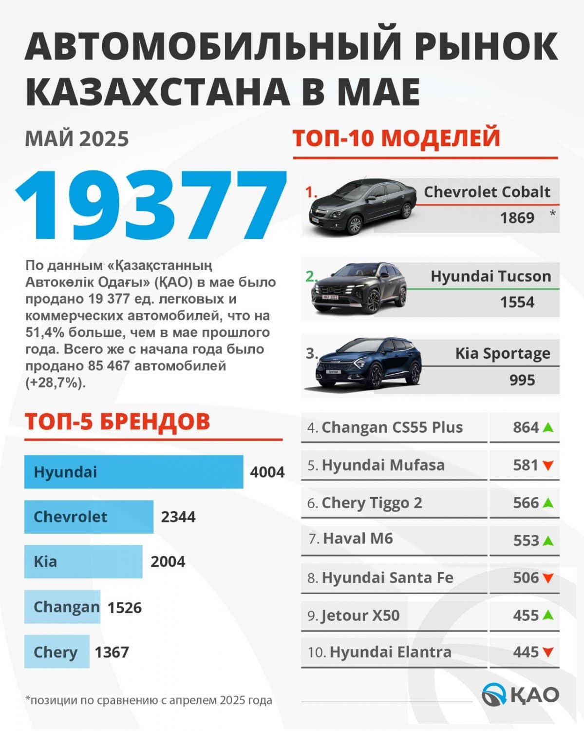 «Казахстанский автомобильный союз» (КАО) подвел итоги продаж новых автомобилей в стране в мае 2025 года. Всего было реализовано 19 377 единиц авто, и это на 51% больше, чем в мае 2024 года: в то время, как в России рынок новых авто никак не выйдет из пике, в Казахстане тренд совершенно противоположный.