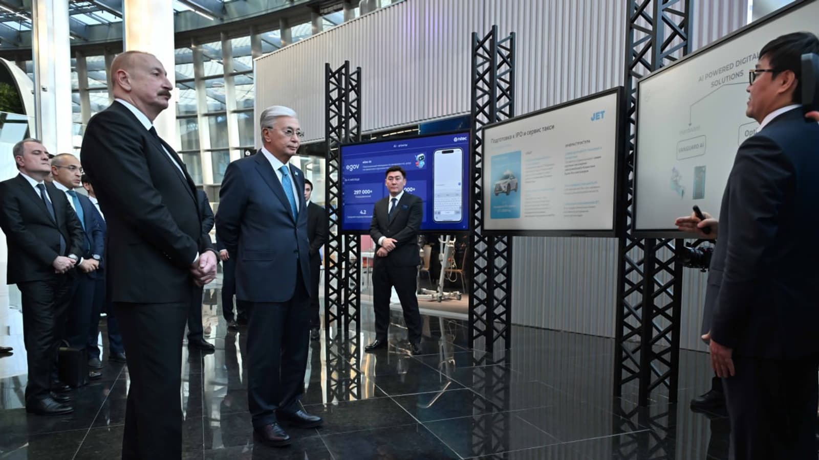 Министр ИИ и цифрового развития Казахстана Жаслан Мадиев представил лидерам концепцию AI-Driven Government. Это ситуационный центр для анализа и управления государственными процессами, в том числе для принятия GovTech-решений. Также Токаев и Алиев ознакомились с технологиями Smart City, проектами Samruk-Kazyna, отдельными образцами робототехники.