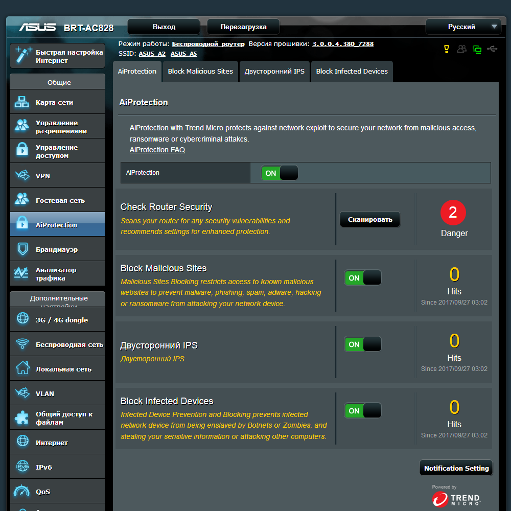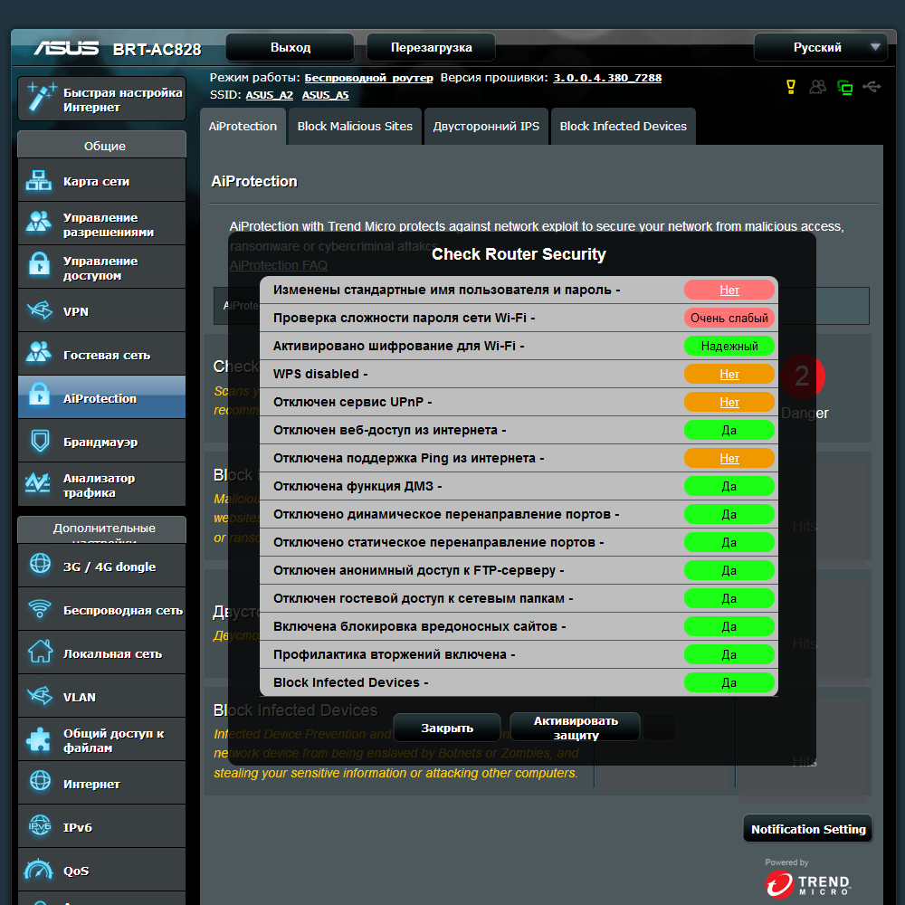 В разделе «AiProtection» собраны несколько специальных приложений, которые компания лицензировала у Trend Micro. В частности здесь мы видим функцию сканирования настроек самого роутера с целью выявления потенциально слабых или ненадежных установок, а также автоматического устранения недочетов. Учитывая большой набор возможностей устройства, данный сервис может быть полезен начинающим администраторам.