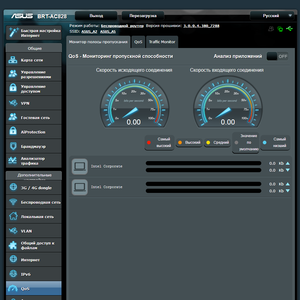 Функция контроля трафика QoS имеет три режима работы: автоматический (адаптивный), традиционный (с установкой приоритетов) и ограничения скоростей загрузки и отдачи клиентам по IP-адресам. Также присутствует страница с монитором текущего трафика.