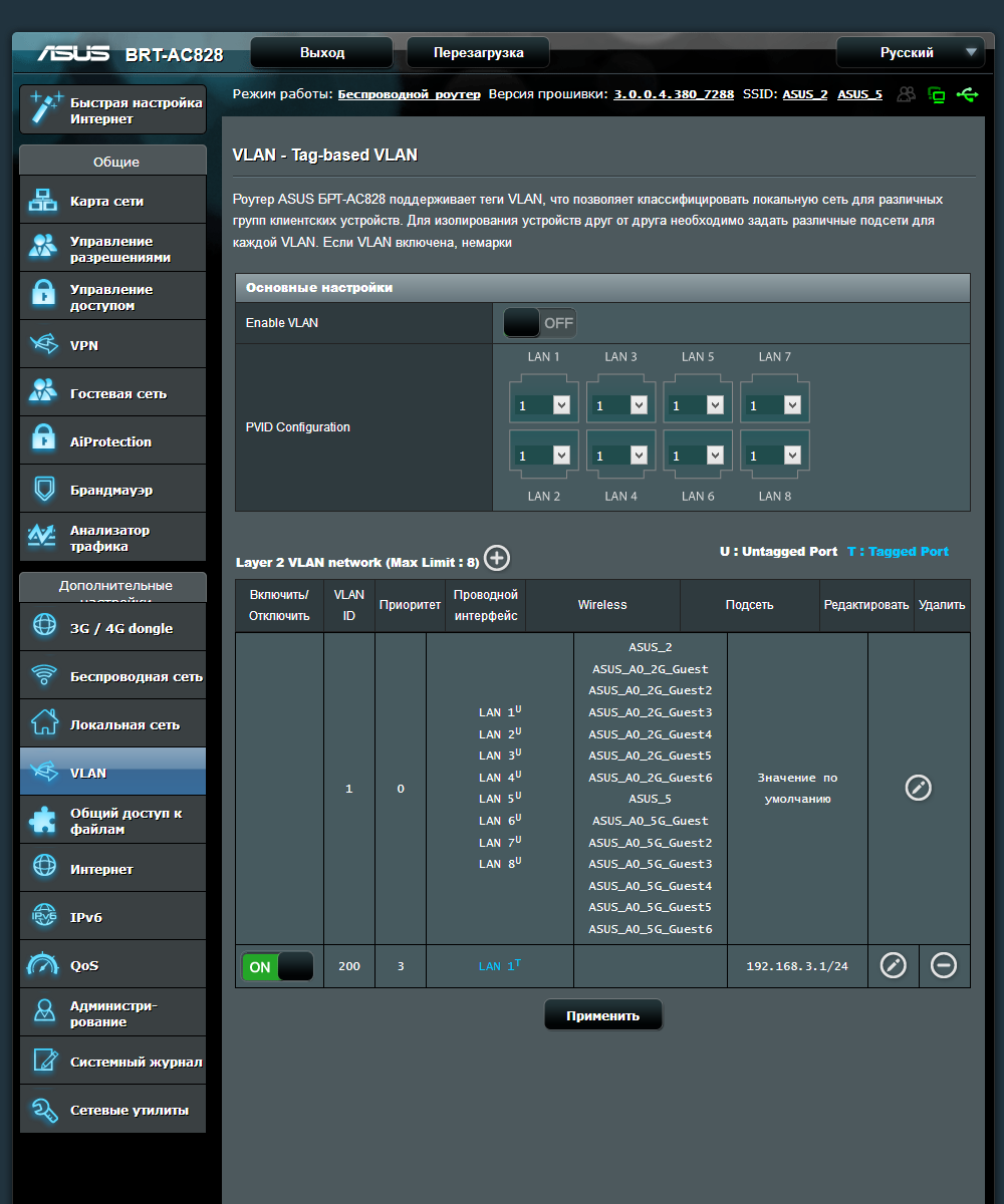 Еще одним нововведением является поддержка VLAN. В роутере можно настроить до восьми виртуальных сетей и распределить проводные порты и беспроводные интерфейсы по ним. В параметрах также предусмотрено указание собственной подсети для раздачи IP-адресов и приоритета. Данная возможность позволит вам полностью отделить трафик гостевых беспроводных сетей и защитить свою внутреннюю локальную сеть.