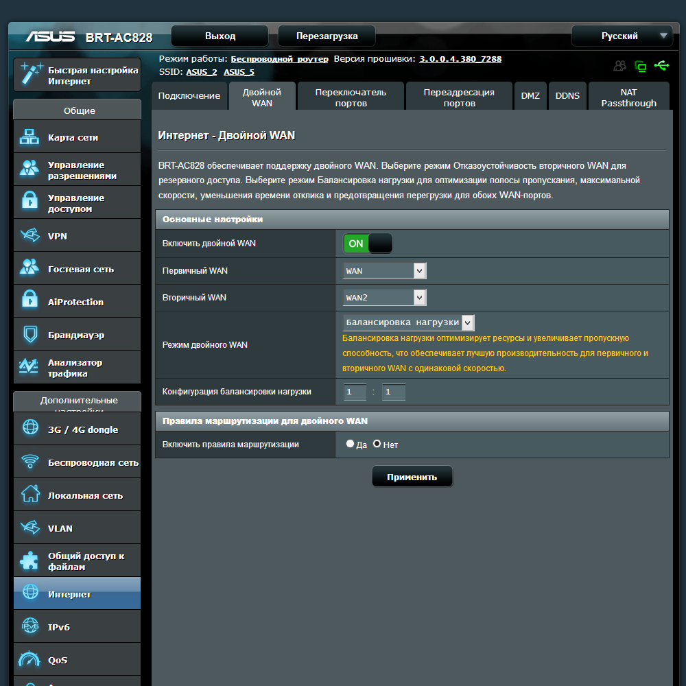 Компания особенно выделяет режим работы с двумя портами для подключения к интернету. В маркетинговых материалах описан вариант получения скорости 2 Гбит/с для загрузки данных из сети. Правда надо понимать, что это не только дорого, но и требует поддержки со стороны провайдера. Но иметь резервное подключение, особенно в бизнес-сегменте, конечно полезно. Кроме того, надо отметить, что некоторые из функций роутера могут быть несовместимы с режимом DualWAN.