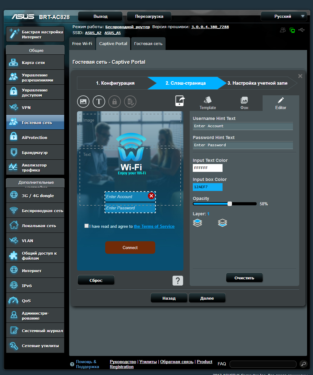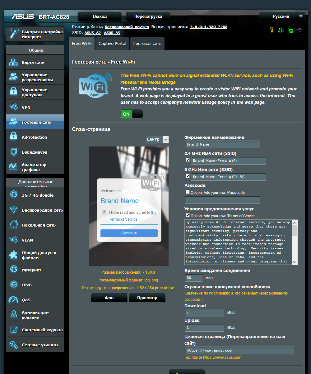 Далее вы уже можете в браузере выбирать любые сайты и пользоваться другими приложениями. С рассматриваемым роутером вам доступны выбор имени сети, изменение дизайна стартовой страницы (заголовок, текст, изображение фона), указание адреса перехода на сайт компании, создание текста условий предоставления услуг.