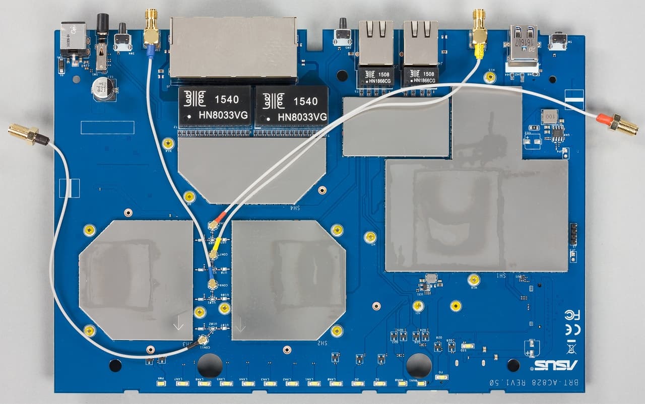 Все основные микросхемы на верхней стороне печатной платы закрыты экранами — в частности два радиоблока, сетевой коммутатор, трансиверы портов WAN и основной процессор с оперативной и флэш-памятью. Дополнительно на них установлена пара алюминиевых радиаторов. С обратной стороны есть только экран напротив процессора и алюминиевая пластина под радиоблоками.