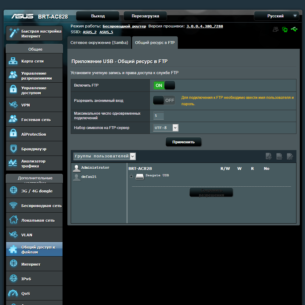 Подключение внешних USB-накопителей позволяет реализовать на роутере некоторые функции сетевого накопителя. В частности можно использовать диски с файловыми системами NTFS, FAT32, EXT2/3/4 и HFS+, работать с файлами по протоколам SMB и FTP, создать в роутере базу пользователей и групп для выдачи им прав на общие ресурсы. Для работы на большой скорости не забываем отключить опцию «Уменьшение помех USB 3.0» в настройках беспроводной точки доступа в диапазоне 2,4 ГГц.
