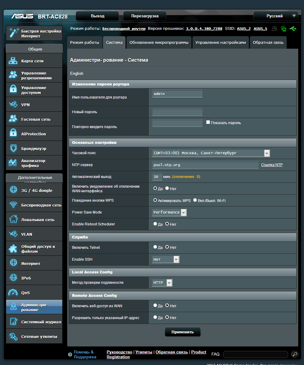 В группе «Администрирование» традиционно собраны пункты по обновлению прошивки, работе с конфигурацией, выбор режима работы (роутер или точка доступа), системные опции (изменение пароля администратора, настройка часов, удаленный доступ, telnet/ssh).