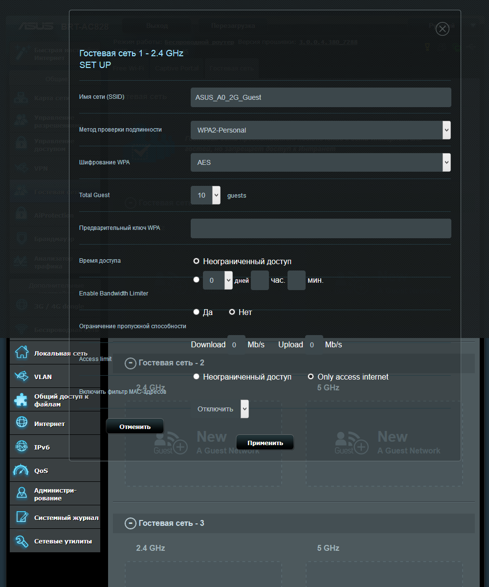 Итак, всего здесь можно создать по шесть дополнительных беспроводных сетей в каждом из двух диапазонов. Для новых сетей вы придумываете имя, устанавливаете тип защиты (включая открытую сеть), можете ограничить максимальное число клиентов и длительность их работы с сетью, ограничить скорости приема и передачи информации, а также разрешить доступ к локальному сегменту сети (по умолчанию гости могут только работать с интернетом).