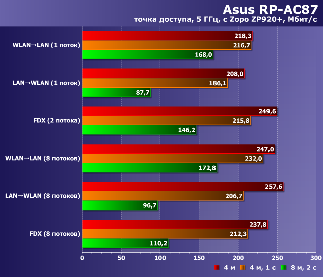 Как мы уже писали выше, работать в 2,4 ГГц на этой паре оборудования смысла нет. Но цифры мы все-таки получили: клиент через мост может получать от 280 Мбит/с в один поток до 440 Мбит/с в многопоточном режиме. Давно мы не видели таких высоких значений для диапазона 2,4 ГГц! Впрочем, у большинства «простых» клиентов антенн все-таки меньше, так что их показатели будут в три-четыре раза ниже. Найти устройство с одним диапазоном и «сильным» адаптером 802.11n в нем было сложно всегда, а уж с появлением и распространением 802.11ac этому режиму работы большинство производителей вполне ожидаемо не уделяют большого внимания. Хотя результаты тестов в 5 ГГц сложно назвать поводом для этого. Если скорость 300+ Мбит/с в один поток мало отличается от 2,4 ГГц, то 800 Мбит/с в многопоточном режиме — это в два раза больше. Так что если вы купили 4К-телевизор и хотите использовать его без проводов для просмотра высокобитрейтного видео — Asus RP-AC87 сможет вам помочь. Но, конечно, потребуется и соответствующий роутер.