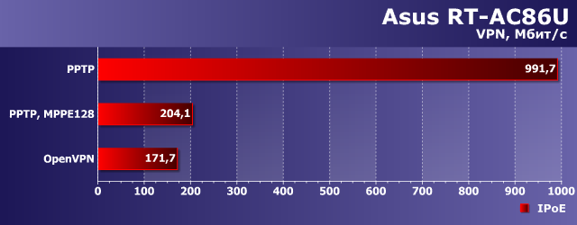 Как мы видим, если не использовать шифрование, то можно получить очень высокую скорость. Но и с шифрованием результаты очень впечатляют — около 200 Мбит/с и для PPTP с MPPE128 и для OpenVPN. К сожалению, проверить скорость сервера PPTP при других режимах подключения к интернету не получилось, а у OpenVPN проблем не было. При этом его показатели даже подросли — до 230 Мбит/с в PPTP и L2TP. Вероятно здесь сыграло роль отключение аппаратного NAT в этих режимах. С другой стороны — а зачем еще использовать такой мощный процессор?
